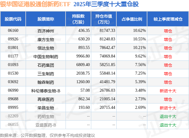 从基金规模来看,银华国证港股通创新药ETF基金2025年三季度公布的基金规模为77.01亿元,较上一期规模27.27亿元变化了49.73亿元,环比变化了182.35%。该基金最新一期资产配置为:股票占净值比97.59%,无债券类资产,现金占净值比2.67%。从基金持仓来看,该基金当季前十大股票仓位达70.1%,第一大重仓股为百济神州(06160),持仓占比为10.62%。